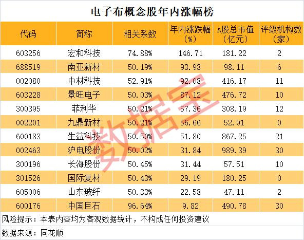 据数据宝统计,A股市场上有电子布相关产品的概念股合计12只,其中宏和科技、中国巨石等相关性较高。
